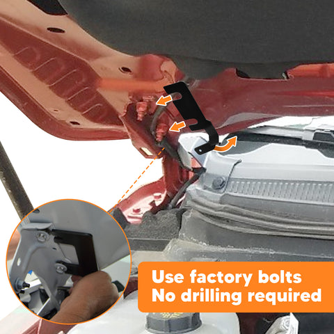 - Use your factory hood hinge bolt to install.